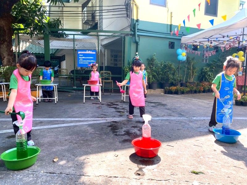 เด็ก ๆ สนุกสนานกับการเล่นเกมกรอกน้ำสีใส่ขวด