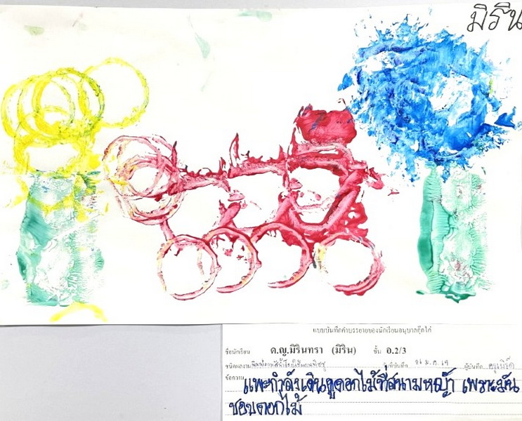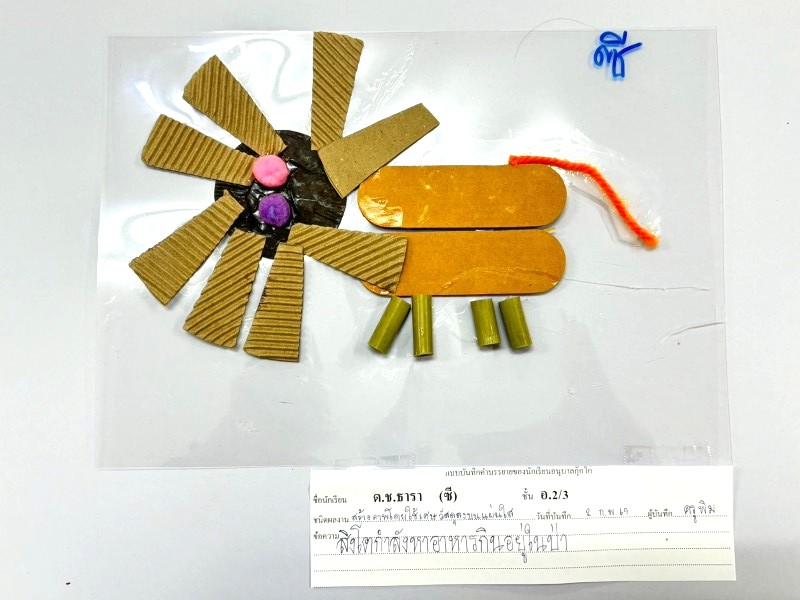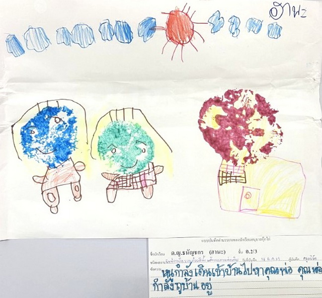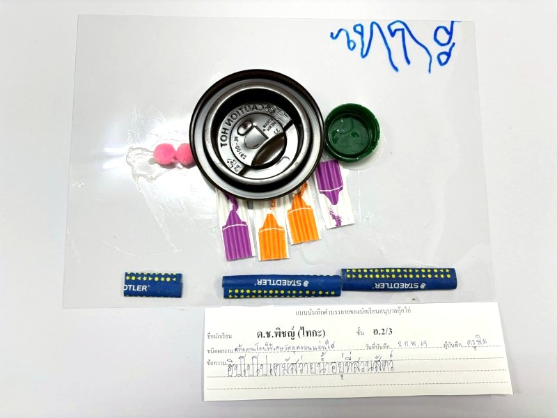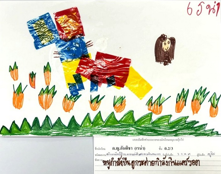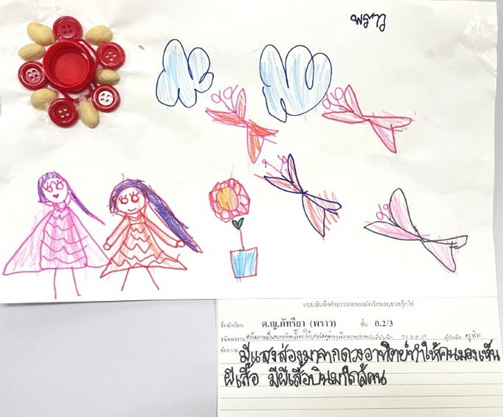 ผลงานการสร้างภาพเป็นดวงอาทิตย์โดยใช้เศษวัสดุต่าง ๆ แล้ววาดภาพประกอบ พราว : มีแสงส่องมาจากดวงอาทิตย์ทำให้คนมองเห็นผีเสื้อ มีผีเสื้อบินมาใกล้คน