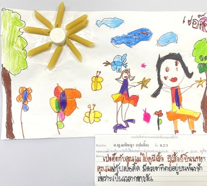 ผลงานการสร้างภาพเป็นดวงอาทิตย์โดยใช้เศษวัสดุต่าง ๆ แล้ววาดภาพประกอบ เปอติ๊ด : เปอติ๊ดกับคุณแม่ไปดูผีเสื้อ ผีสื้อก็บินมาหาคุณแม่กับเปอติ๊ด มีดวงอาทิตย์อยู่บนท้องฟ้าเพราะเป็นเวลากลางวัน
