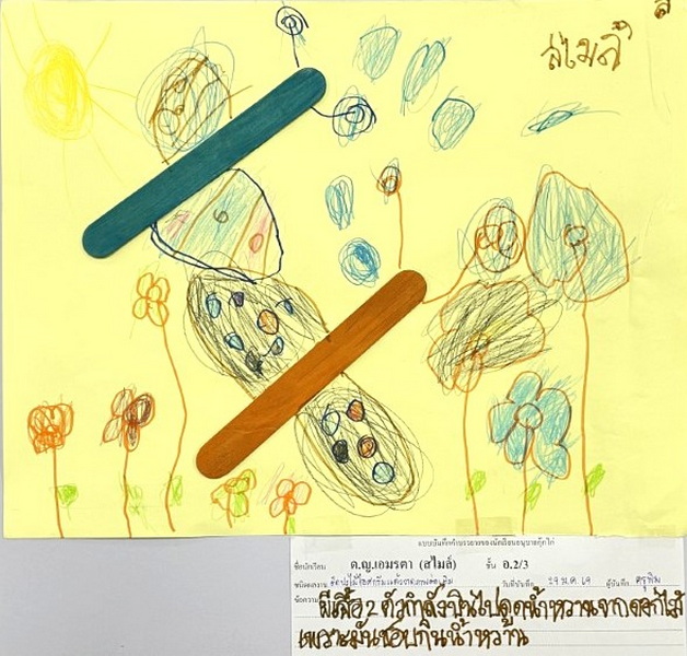 ผลงานการติดปะไม้ไอศกรีมแล้ววาดภาพต่อเติม สไมล์ : ผีเสื้อ 2 ตัวกำลังบินไปดูดน้ำหวานจากดอกไม้ เพราะมันชอบกินน้ำหวาน