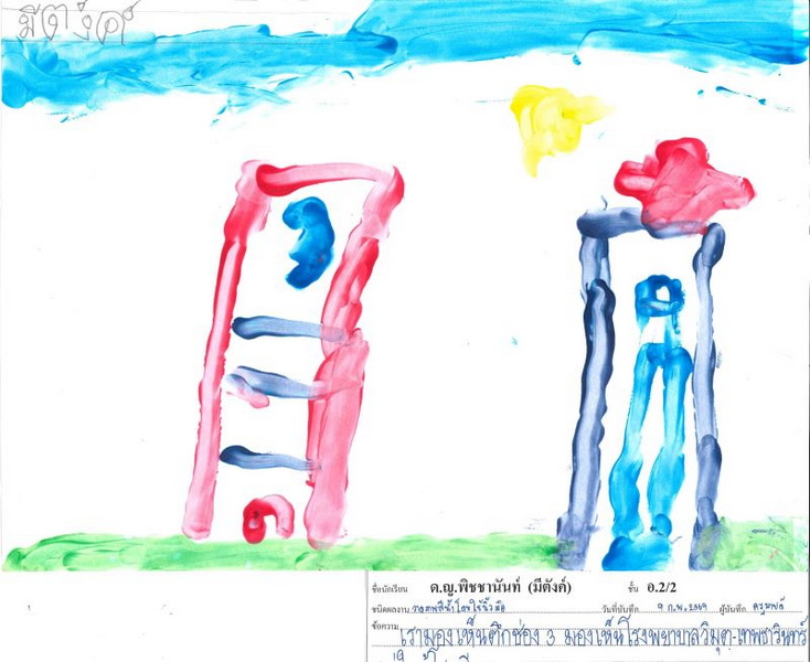 ผลงานการจำลองสถานที่ที่อยู่ใกล้โรงเรียนโดยใช้เศษวัสดุ พีโน่ : โรงเรียนอนุบาลกุ๊กไก่