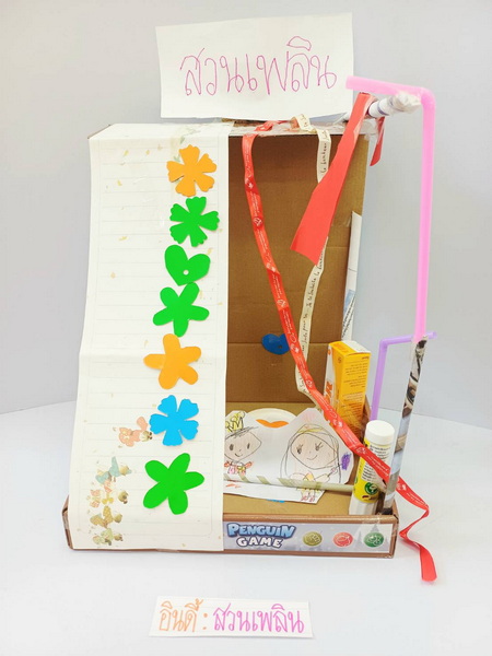 ผลงานการจำลองสถานที่ที่อยู่ใกล้โรงเรียนโดยใช้เศษวัสดุ อินดี้ : สวนเพลิน