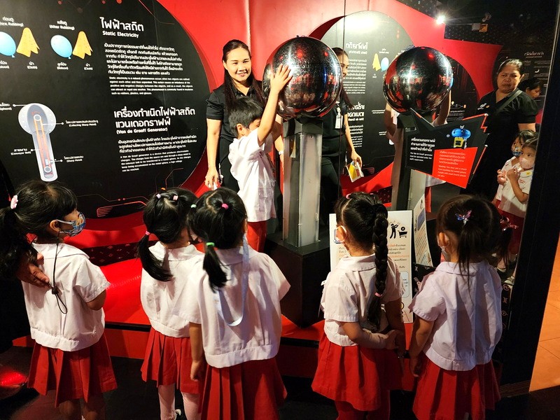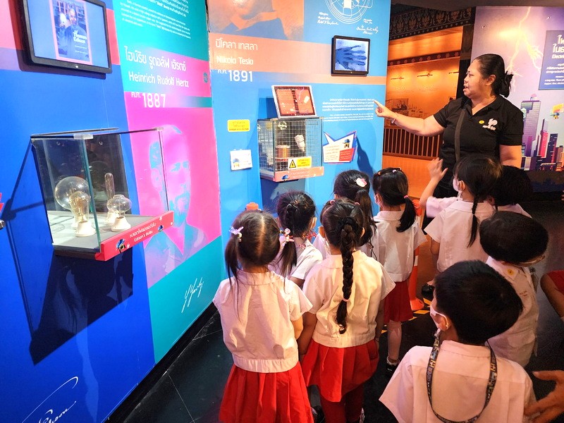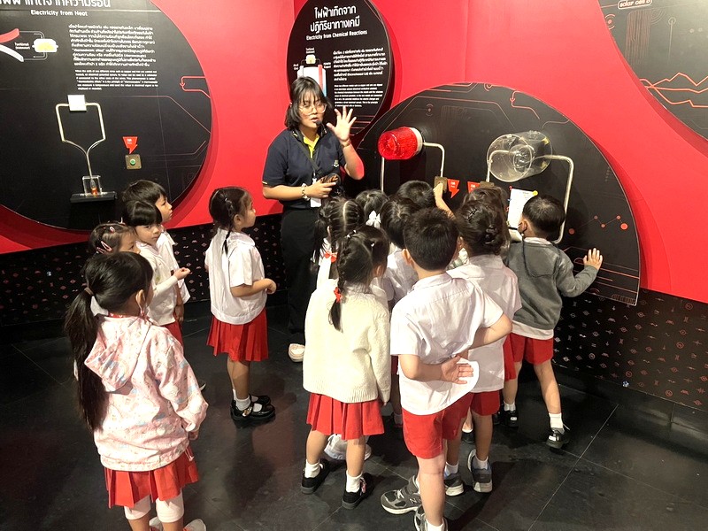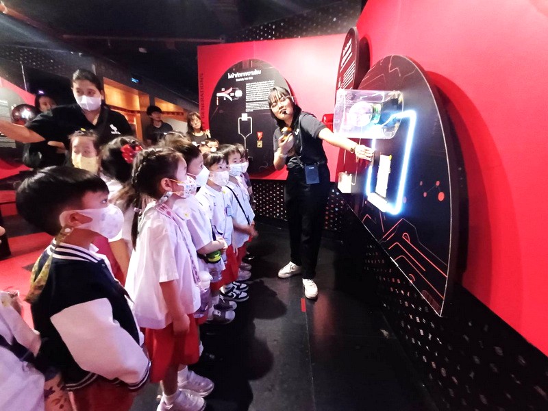 เด็ก ๆ ฟังพี่วิทยากรเล่าถึงการเกิดไฟฟ้า การเดินทางของกระแสไฟฟ้าในนิทรรศการเมืองไฟฟ้า