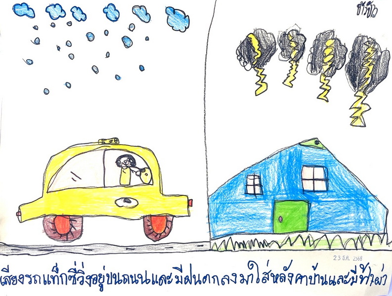 ผลงานวาดภาพเสียงธรรมชาติและเสียงที่มนุษย์สร้างขึ้น ข้าวจ้าว : เสียงรถแท็กซี่วิ่งอยู่บนถนนและมีฝนตกลงมาใส่หลังคาบ้านและมีฟ้าผ่า