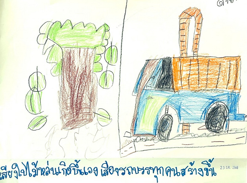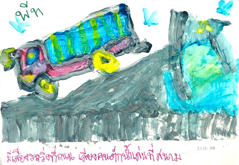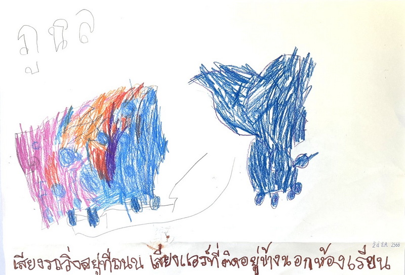 ผลงานวาดภาพทดลองฟังเสียงที่ได้ยิน ภูนิล : เสียงรถวิ่งอยู่ที่ถนน เสียงแอร์ที่ติดอยู่ข้างนอกห้องเรียน