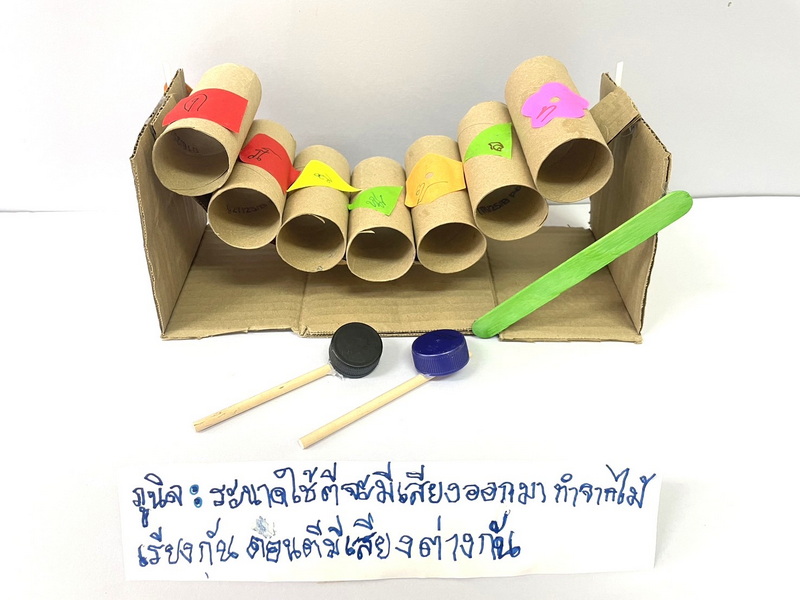 ผลงานประดิษฐ์เครื่องดนตรีด้วยเศษวัสดุ ภูนิล : ระนาดใช้ตีจะมีเสียงออกมา ทำจากไม้เรียงกัน ตอนตีมีเสียงต่างกัน