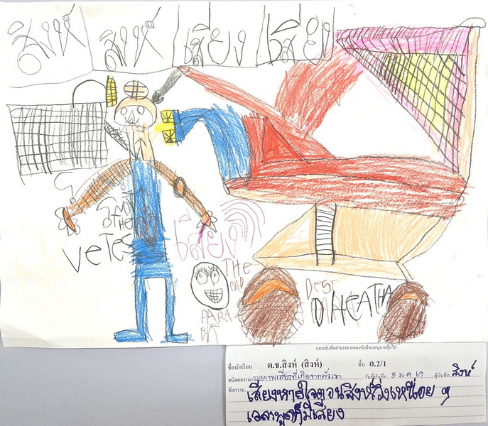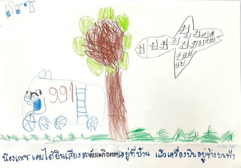 ผลงานวาดภาพเกี่ยวกับเสียงด้วยสีไม้ เกรซ : น้องเกรซเคยได้ยินเสียงรถดับเพลิงตอนอยู่ที่บ้าน แล้วเครื่องบินอยู่ข้างบนฟ้า