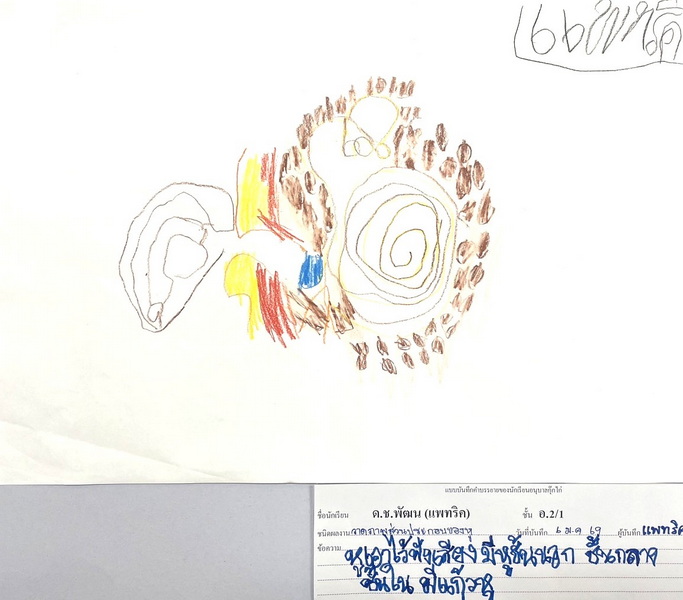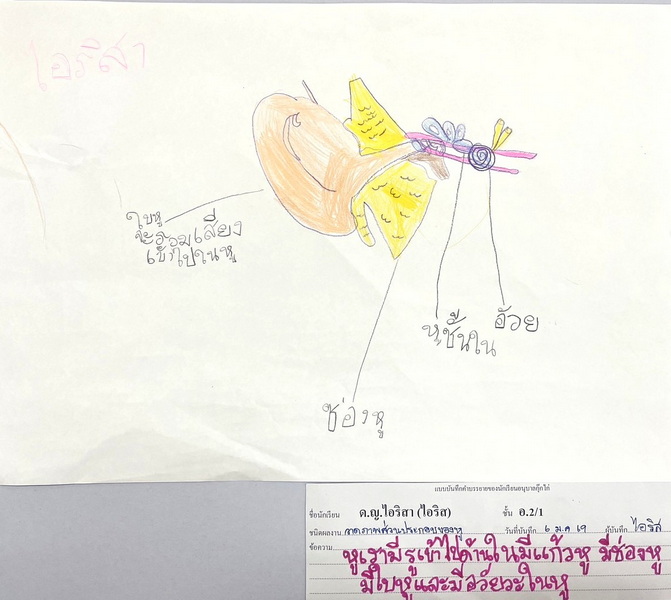 ผลงานวาดภาพส่วนประกอบของหู แพทริค : หูเอาไว้ฟังเสียง มีหูชั้นนอก ชั้นกลาง ชั้นใน มีแก้วหู