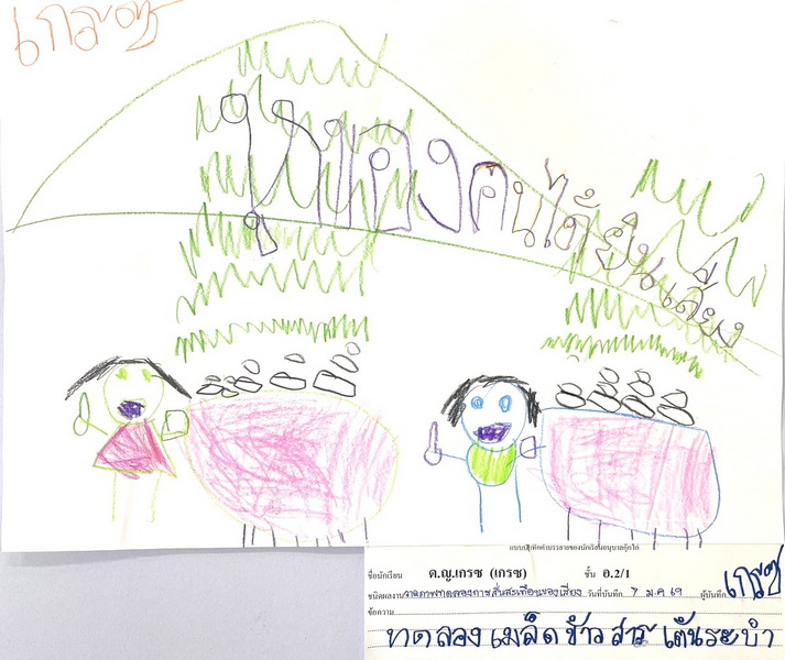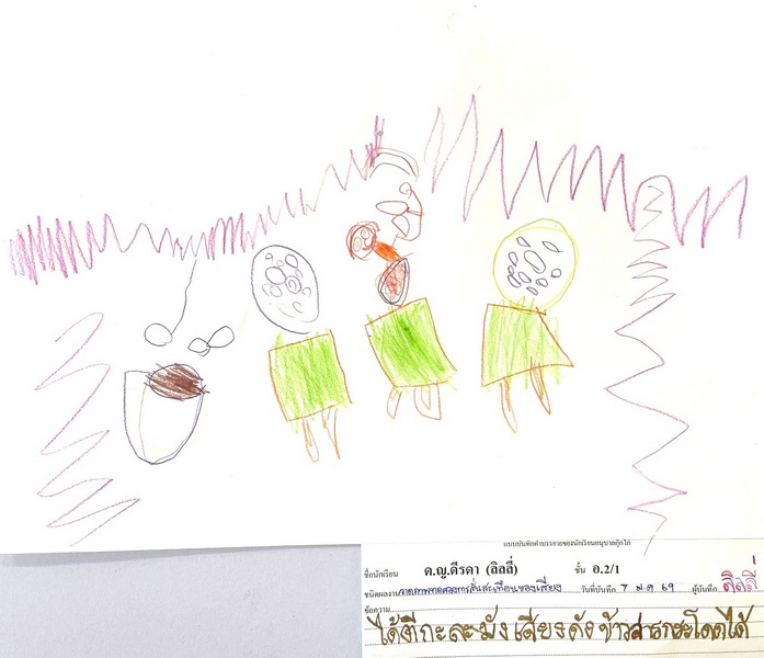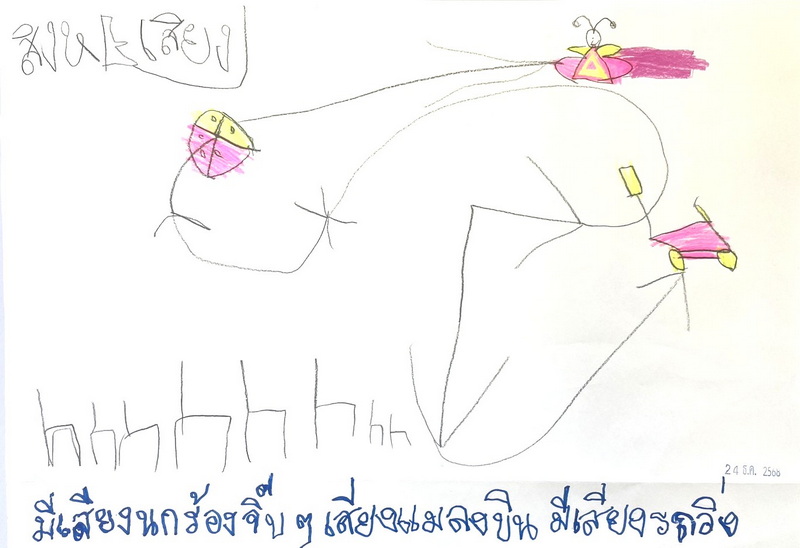 ผลงานวาดภาพทดลองฟังเสียงที่ได้ยิน สิงห์ : มีเสียงนกร้องจิ๊บ ๆ เสียงแมลงบิน มีเสียงรถวิ่ง