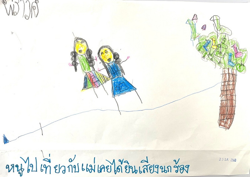 ผลงานวาดภาพเกี่ยวกับเสียงด้วยสีไม้ พราวด์ : หนูไปเที่ยวกับแม่เคยได้ยินเสียงนกร้อง