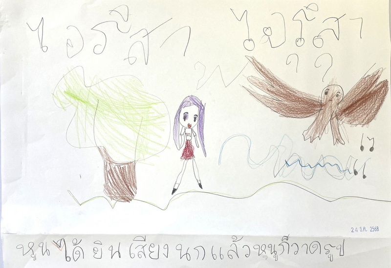 ผลงานวาดภาพทดลองฟังเสียงที่ได้ยิน ไอริส : หนูได้ยินเสียงนกแล้วหนูก็วาดรูป