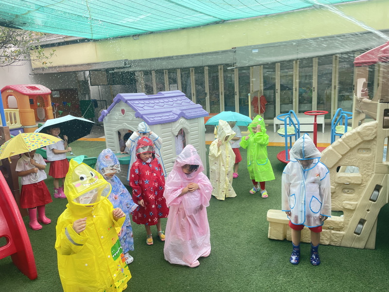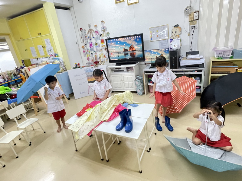 เล่นบทบาทสมมติว่ามีฝนตกลงมาเพื่อเรียนรู้ว่าเมื่อมีฝนตกอุปกรณ์อะไรที่สามารถป้องกันตนเองจากฝน