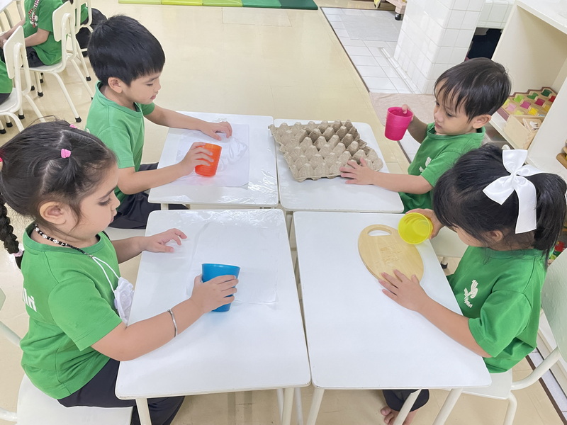 สนใจเลือกวัสดุต่าง ๆ แล้วทดลองเทน้ำลงวัสดุนั้นแล้วสังเกตสิ่งที่เกิดขึ้น