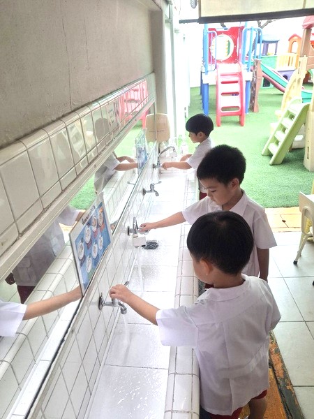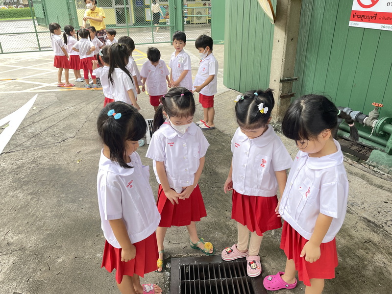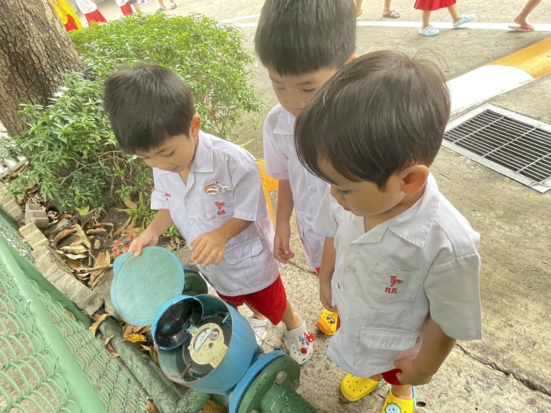 ระหว่างเดินสำรวจแหล่งน้ำในโรงเรียนเด็กให้ความสนใจกับมิเตอร์น้ำประปา