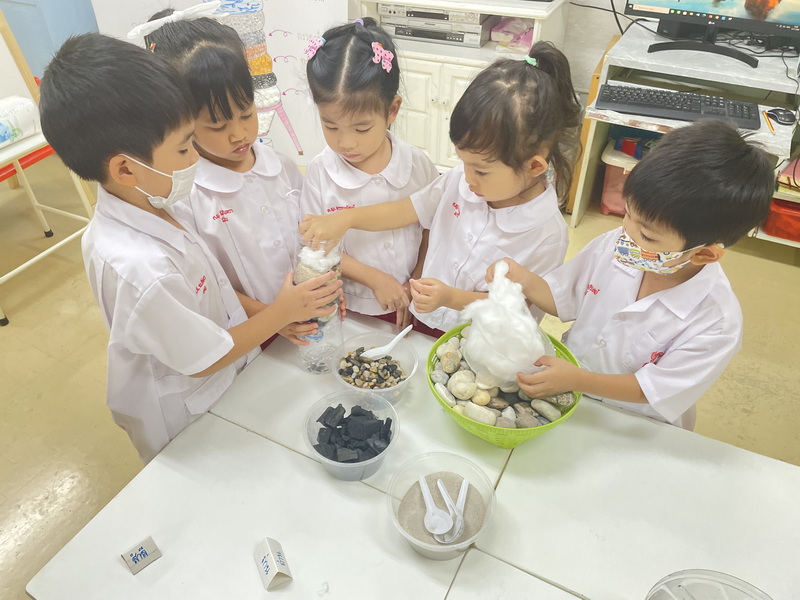 ช่วยกันทดลองกรองน้ำให้สะอาด โดยเลือกใช้วัสดุกันตามที่แต่ละกลุ่มตกลงกัน