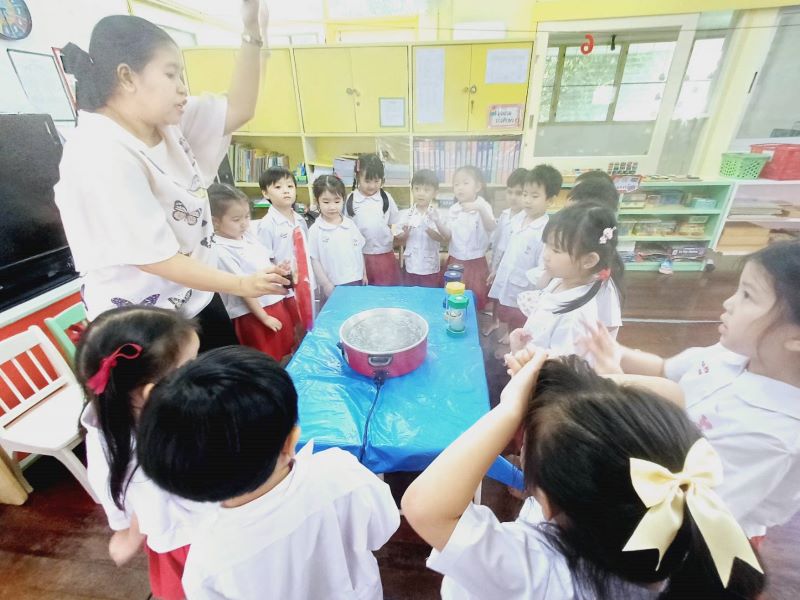 เด็ก ๆ ทดลองต้มน้ำเพื่อสืบค้นถึงสถานะของน้ำโดยสังเกตสิ่งที่เกิดขึ้นระหว่างการต้มน้ำและเมื่อต้มน้ำเสร็จ