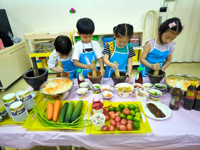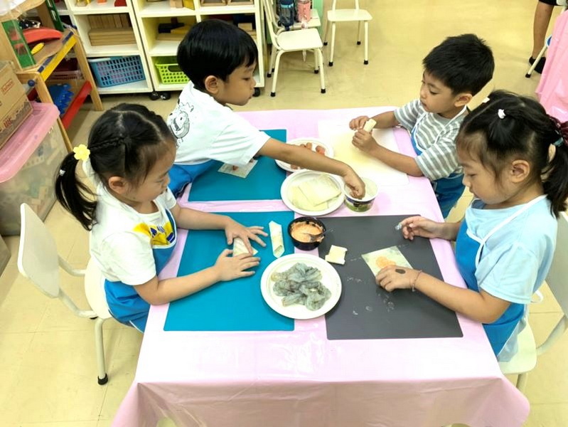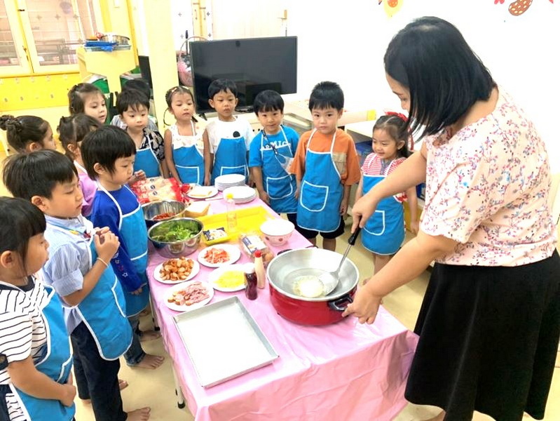 เด็ก ๆ ได้ช่วยกันตอกไข่และตีไข่ให้เข้ากันเพื่อนำมาทำเป็นขนมปังชุบไข่และได้ทดลองการทำอาหารให้สุกโดยใช้ความร้อน เช่น ทอดขนมปังชุบไข่ลงในกระทะ