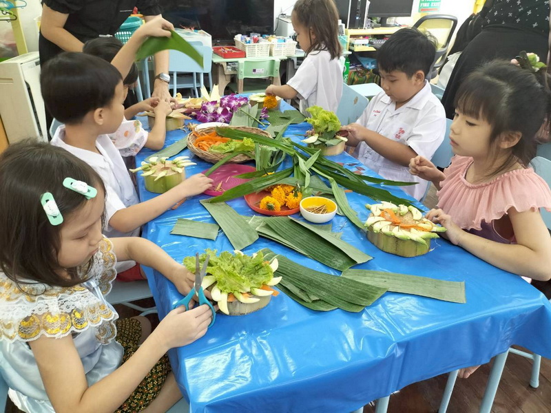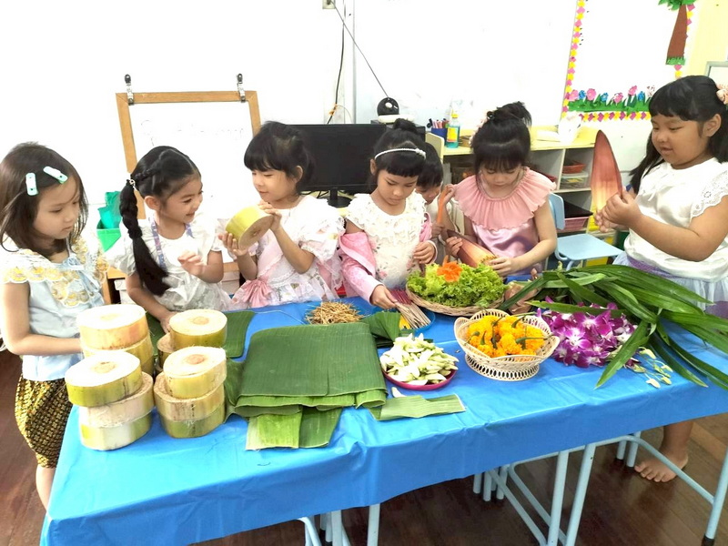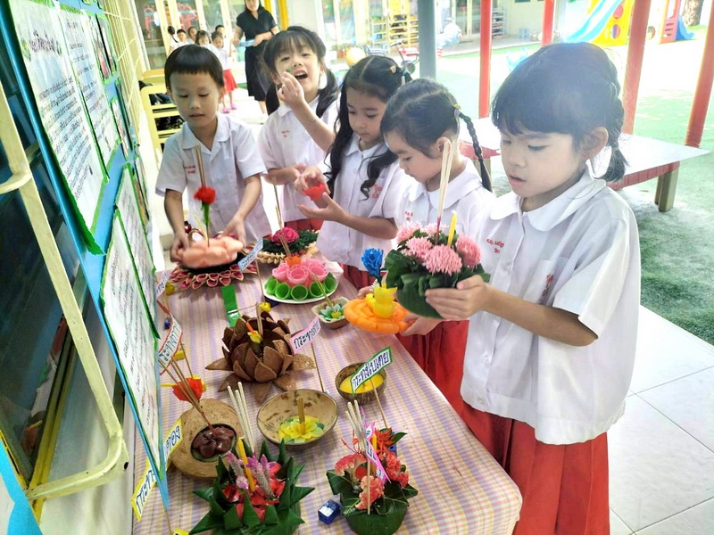 เด็ก ๆ สังเกต สำรวจ สัมผัส กระทงชนิดต่าง ๆ เรียนรู้เกี่ยวกับวัสดุธรรมชาติที่นำมาทำกระทง