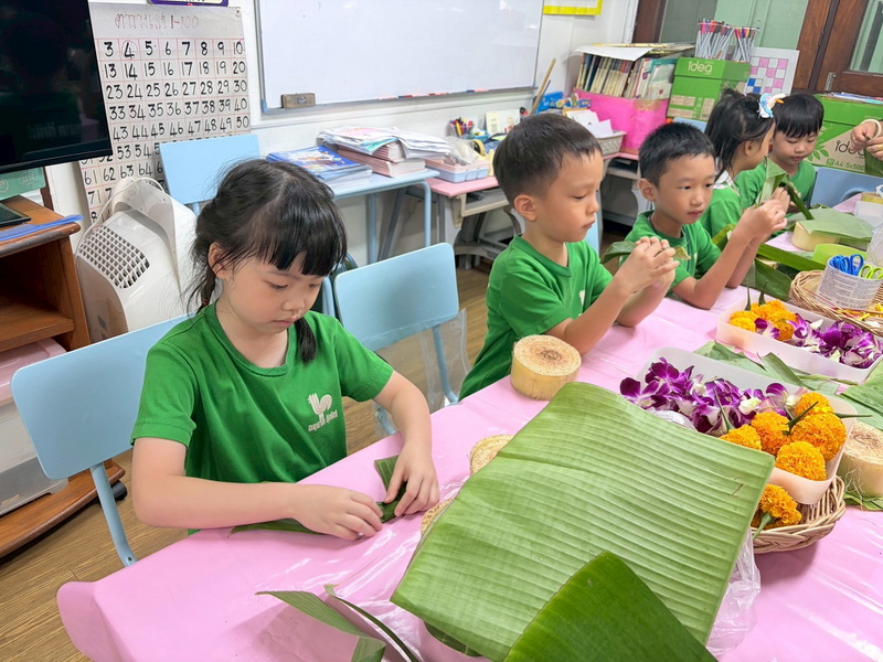 เด็ก ๆ ฝึกพับใบตองให้ได้ตามแบบที่ต้องการ