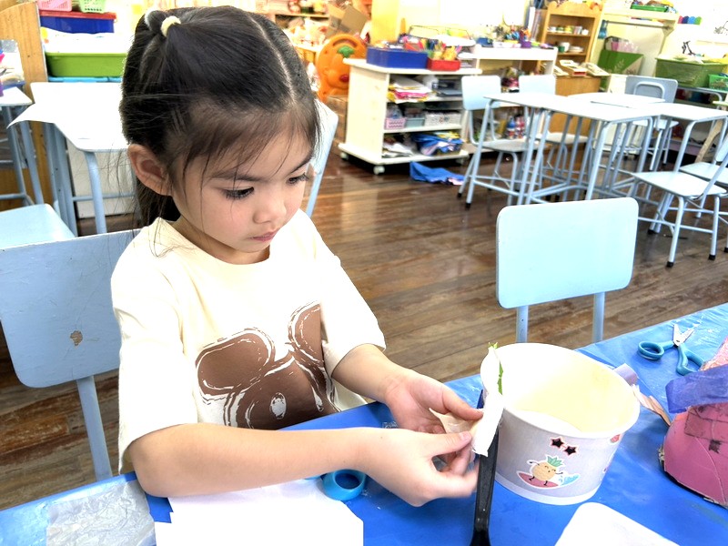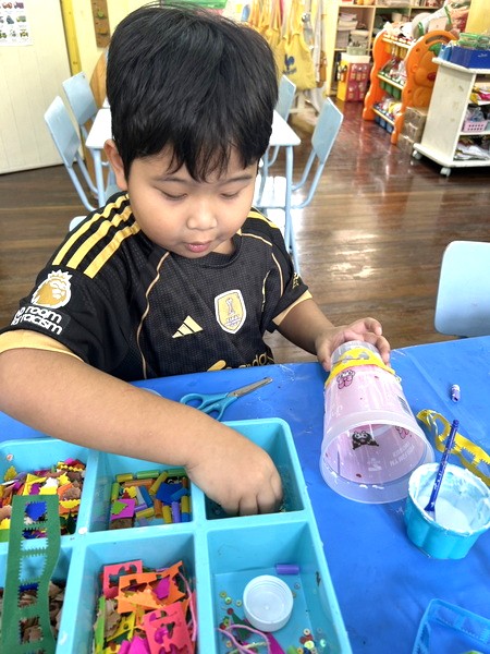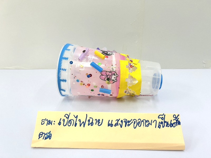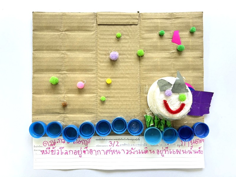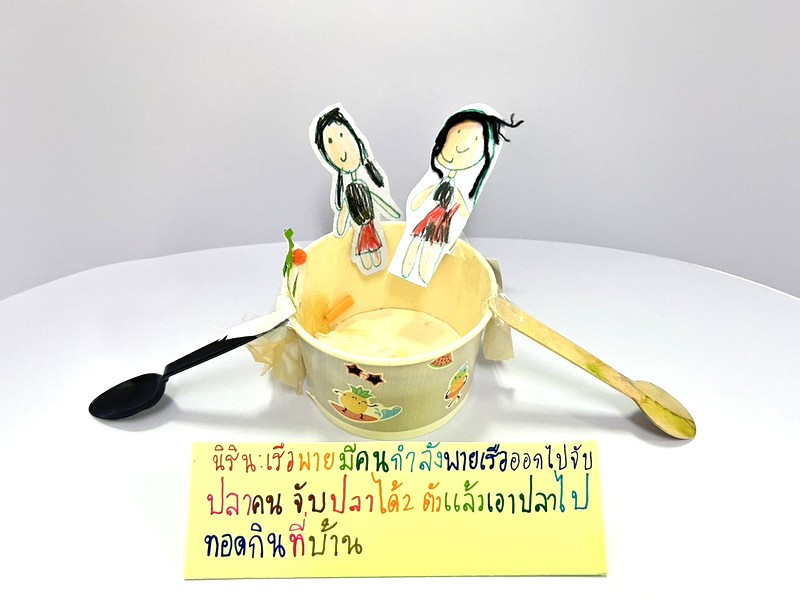 ผลงานการประดิษฐ์ นิริน : เรือพายมีคนกำลังพายเรือออกไปจับปลา คนจับปลาได้ 2 ตัว แล้วเอาไปทอดกินที่บ้าน