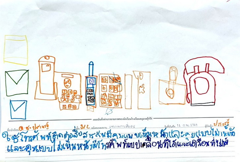 ผลงานวาดภาพการสื่อสาร ปราชญ์ : ใช้โทรศัพท์ติดต่อสื่อสารกนมีคุยแบบเห็นหน้าและคุยแบบไม่เห็นหน้า และคุยแบบไม่เห็นหน้า มีโทรศัพท์แบบเคลื่อนที่ได้และเคลื่อนที่ไม่ได้