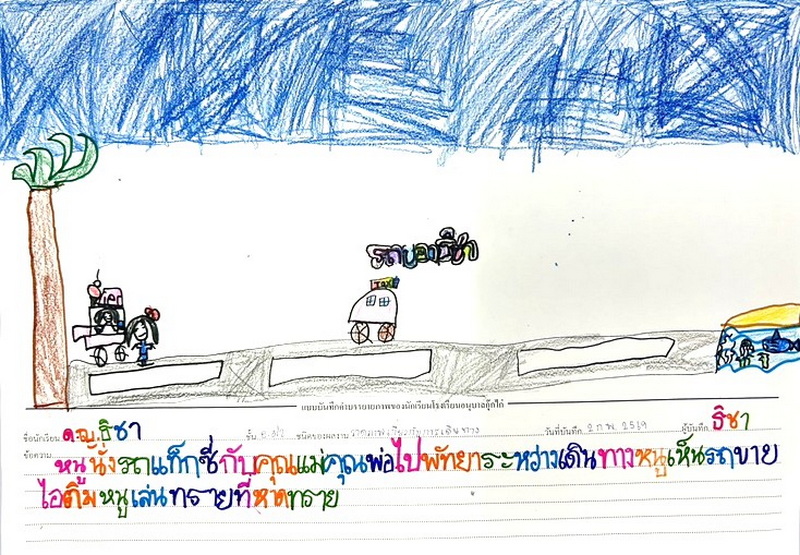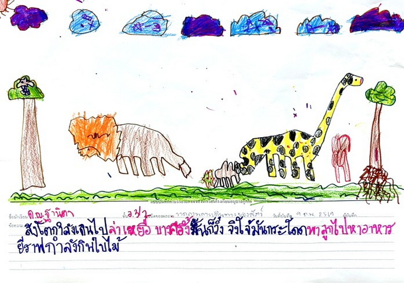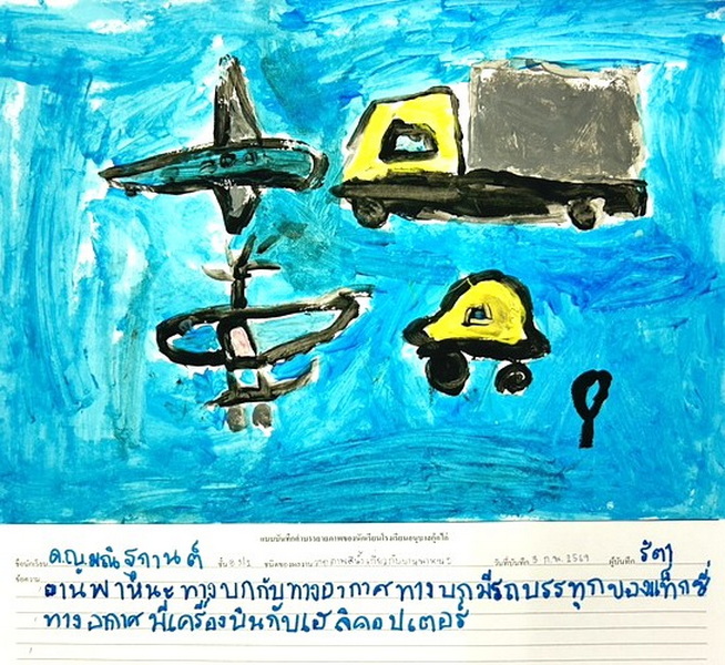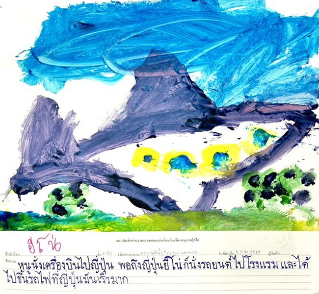 ผลงานวาดภาพสีน้ำเกี่ยวกับยานพาหนะ ยีโน่ : หนูนั่งเครื่องบินไปญี่ปุ่น พอถึงญี่ปุ่นยีโน่ก็นั่งรถยนต์ไปโรงแรมและได้ไปขึ้นรถไฟที่ญี่ปุ่นมันเร็วมาก