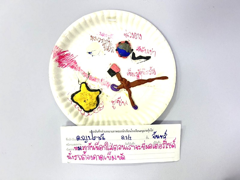 ผลงานปั้นดินน้ำมันเกี่ยวกับอุปกรณ์ป้องกันความปลอดภัย จันทร์ : หมวกันน็อกใส่ตอนเราจะขี่มอเตอร์ไซค์ นั่งรถต้องคาดเข็มขัด