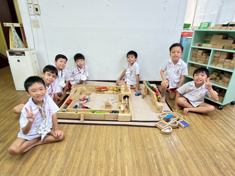 เด็ก ๆ เล่นต่อไม้บล็อกเป็นสถานที่และเส้นทางการเดินทางโดยนำยานพาหนะจำลองมาร่วมเล่นด้วย