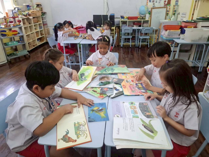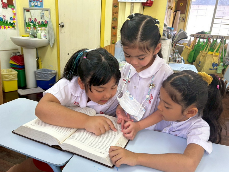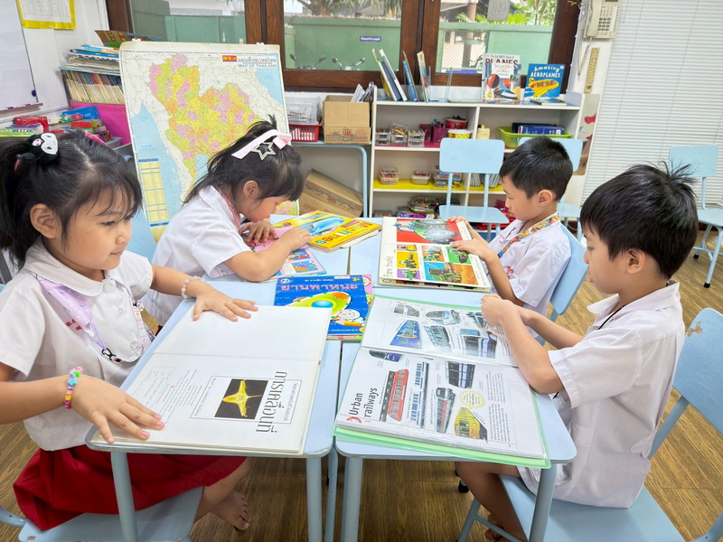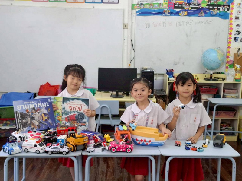 ริวา นิริน และริตานำยานพาหนะของเล่นจำลอง หนังสือมาเล่าให้เพื่อน ๆ ฟัง