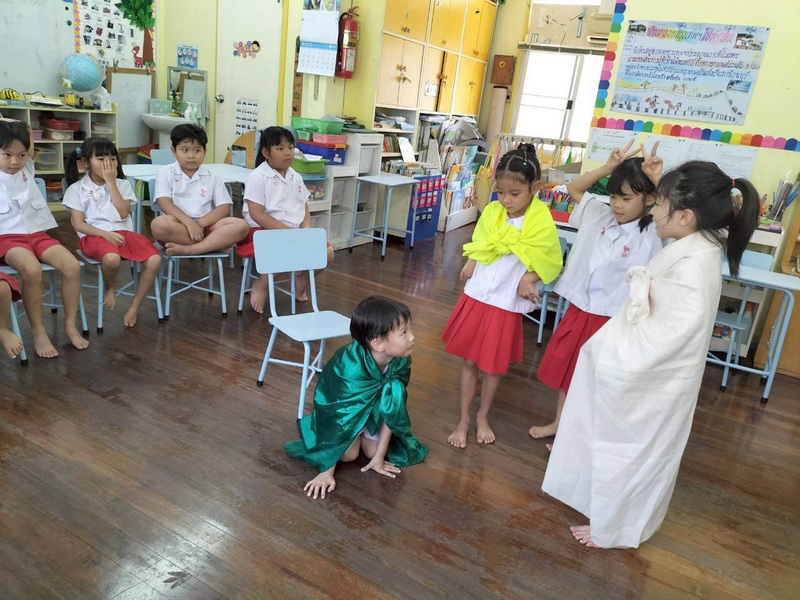 เด็ก ๆ เล่นบทบาทสมมติตามที่ได้ช่วยกันคิดเปลี่ยนแปลงเนื้อเรื่องของนิทานกระต่ายกับเต่า