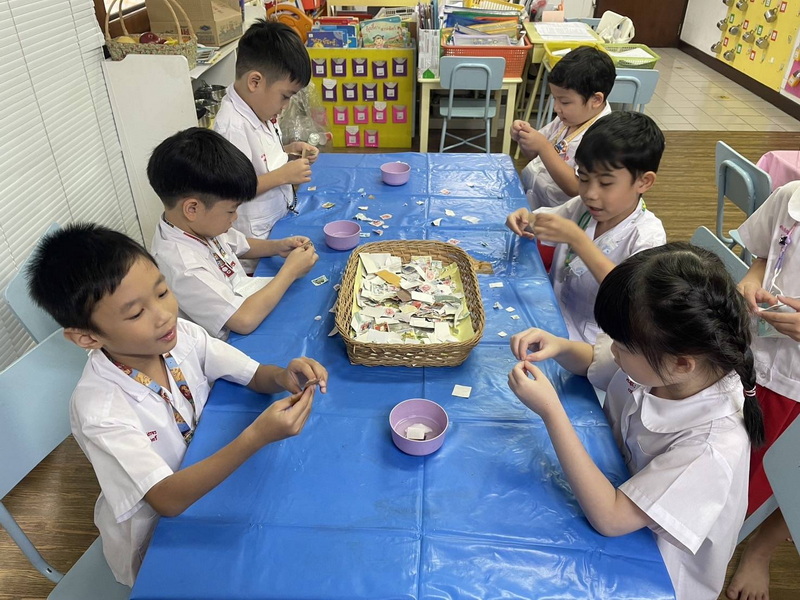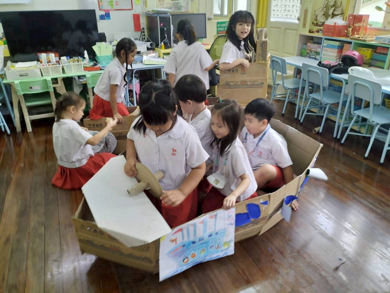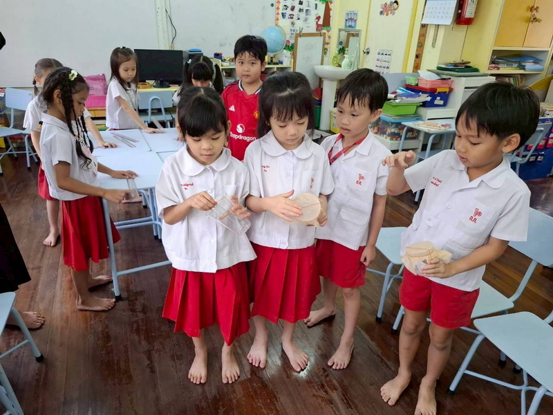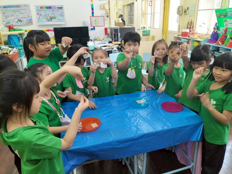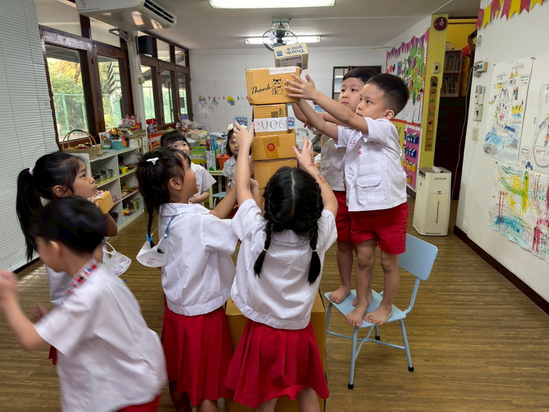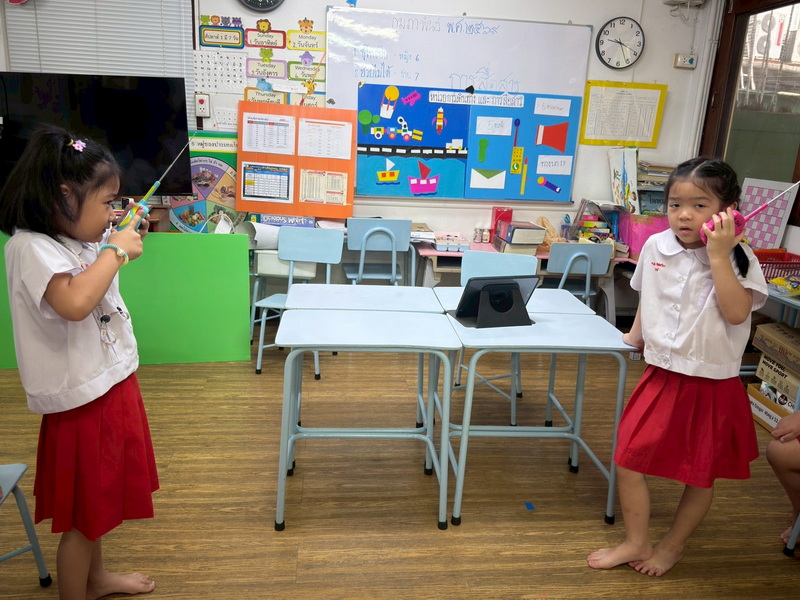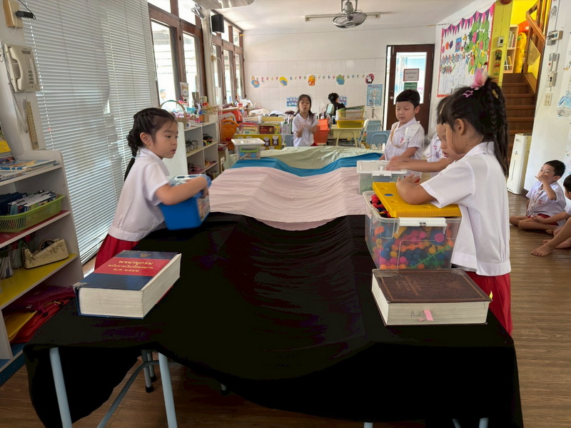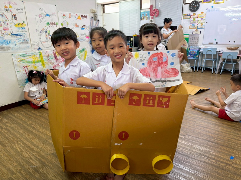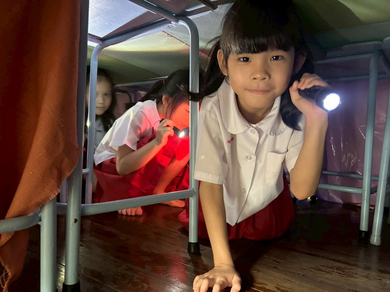 เด็ก ๆ ช่วยกันคิดและนำอุปกรณ์มาจำลองเป็นอุโมงค์