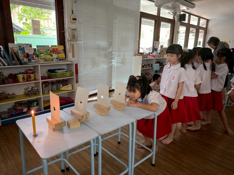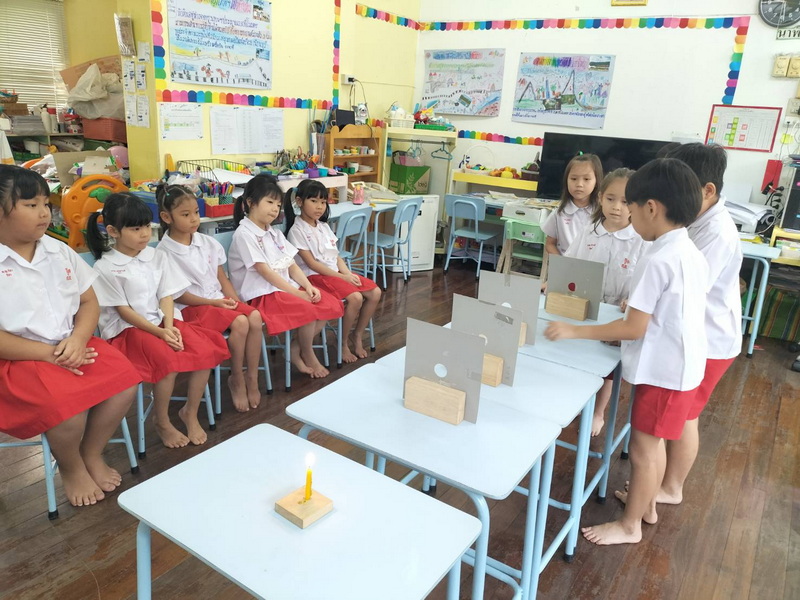 เด็ก ๆ ผลัดกันก้มมองแสงเทียนผ่านรูของกระดาษและสังเกตสิ่งที่เกิดขึ้น