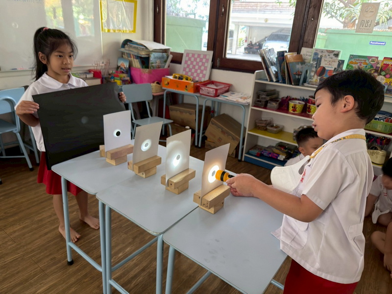 เด็ก ๆ ผลัดกันออกมาทดลองใช้ไฟฉายส่องให้ตรงรูของกระดาษ