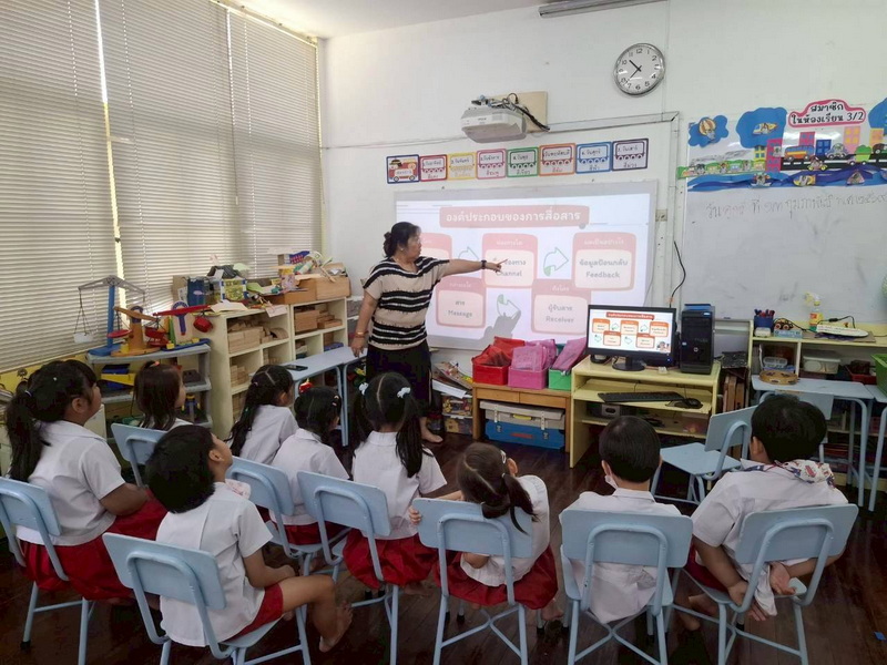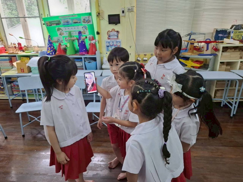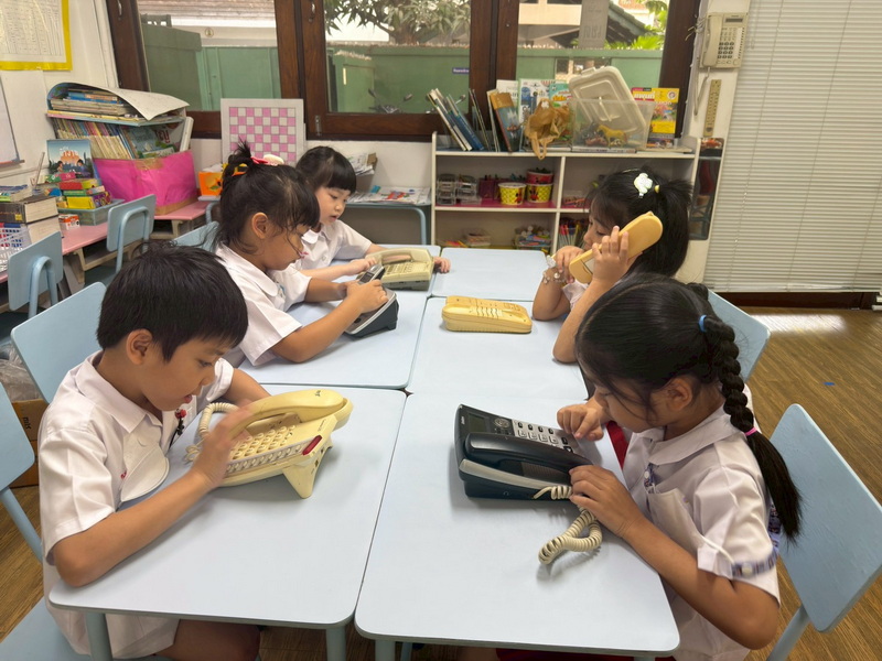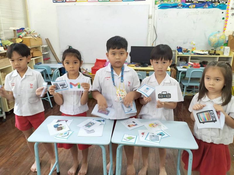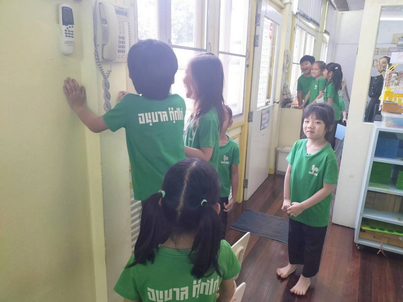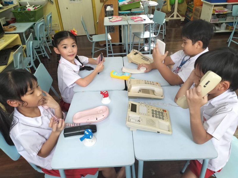 แบ่งกลุ่มทดลองใช้เครื่องมือสื่อสาร Intercom กดเลข 21 ไปที่ห้องของเพื่อนชั้น อ.3/2 และได้พูดคุยสื่อสารกัน