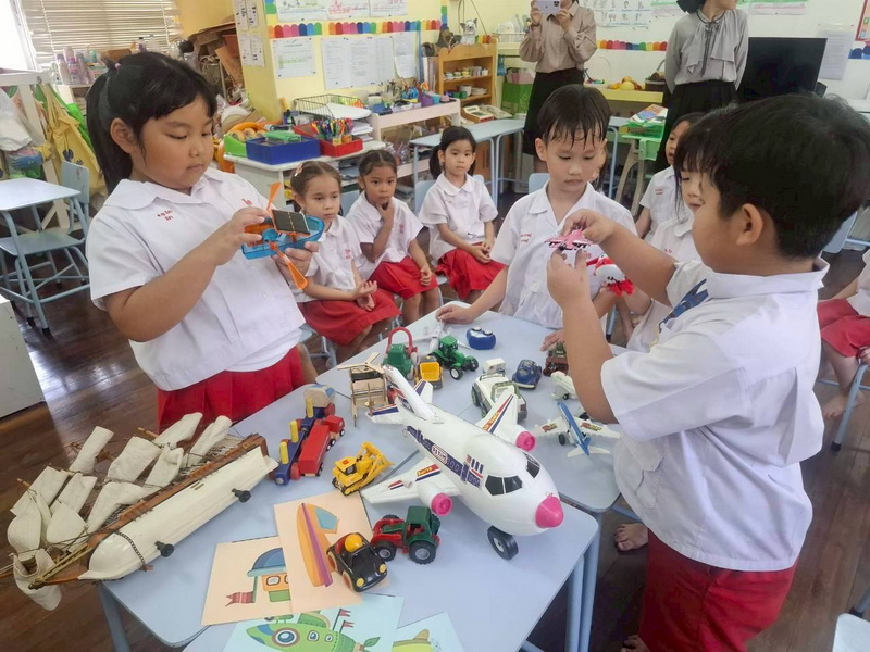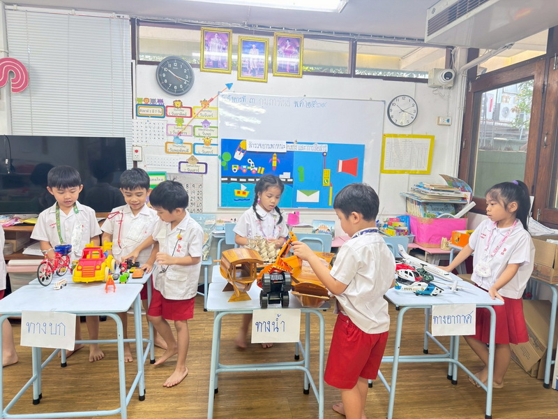 เด็กผลัดกันออกมาแยกประเภทยานพาหนะจำลองที่ใช้ในการเดินทาง ทางบก ทางน้ำ และทางอากาศ