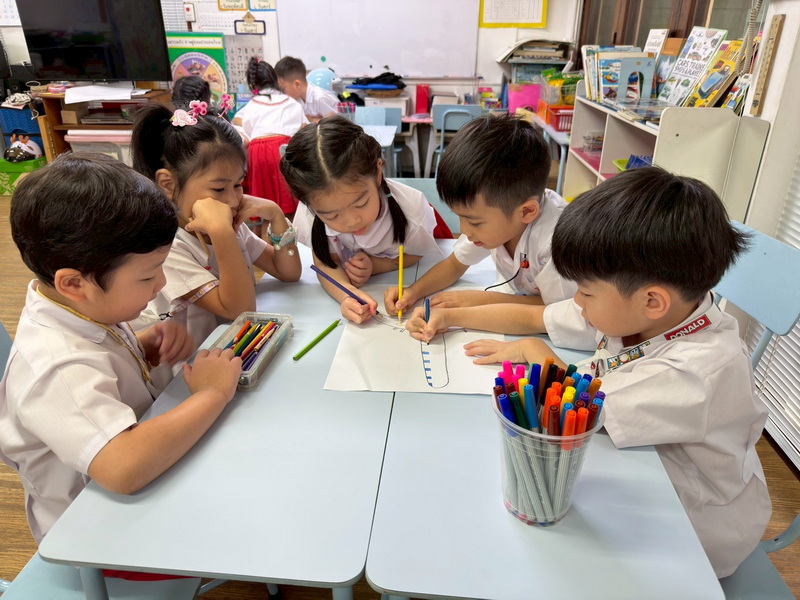 เด็ก ๆช่วยกันออกแบบตาราง Bee-Bot การเดินทางจากบ้านมาโรงเรียนหรือเดินทางจากโรงเรียนกลับบ้าน