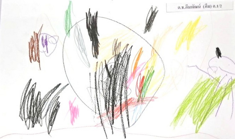 ผลงานวาดภาพประสบการณ์เดิมเกี่ยวกับ “พัด”ด้วยสีเทียน/สีไม้ ภีม (ภีมพัฒน์) : พัดเป็นรูปวงกลม มีสีดำ สีเขียว สีเหลือง พัดเอาพัดก็จะเย็น ๆ
