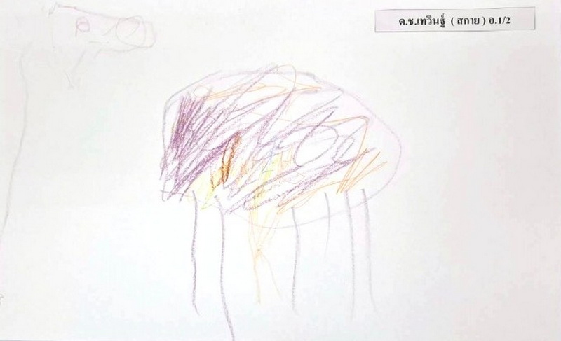ผลงานวาดภาพประสบการณ์เดิมเกี่ยวกับ “พัด”ด้วยสีเทียน/สีไม้ สกาย : แม่ใช้พัด พัดเวลาร้อน