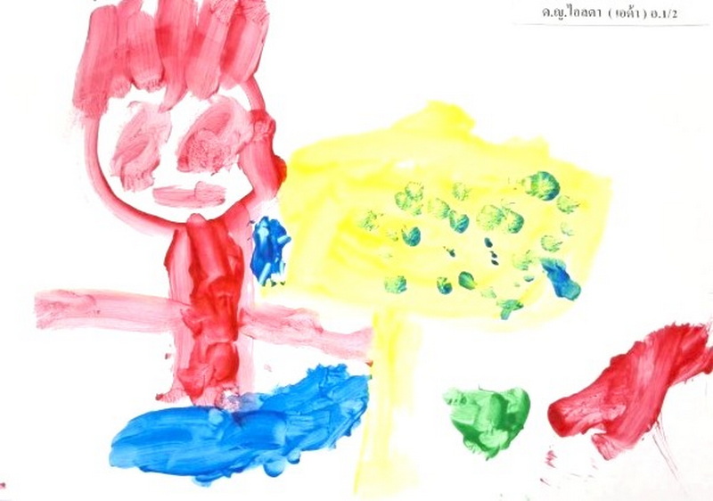 ผลงานวาดภาพประสบการณ์เดิมเกี่ยวกับ “พัด”ด้วยสีน้ำ นิษา : พ่อของนิษาเอาพัดรูปวงกลมอันใหญ่พัดให้นิษาเย็น ๆ