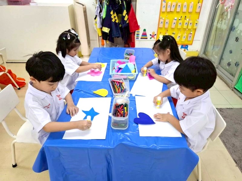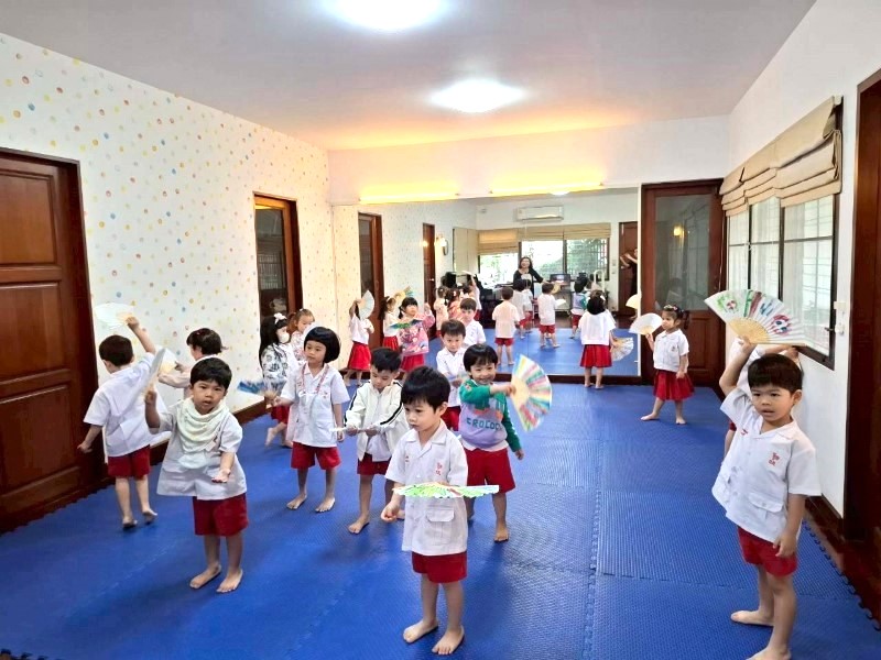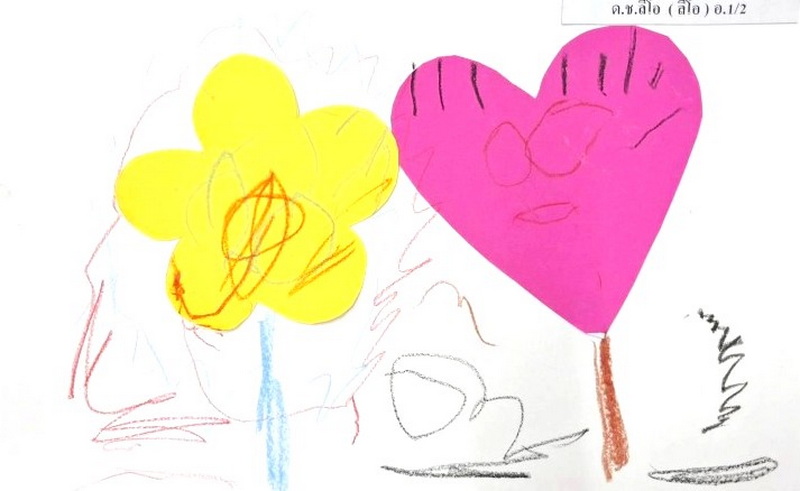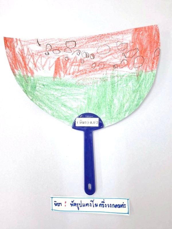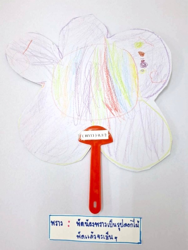 ผลงานติดรูปทรงแล้ววาดรูปต่อเติมเป็นพัดแบบต่าง ๆ ตามความสนใจ ผิงอัน : พัดของหนูเป็นรูปวกลมลายหัวใจกับดอกไม้ค่ะ
