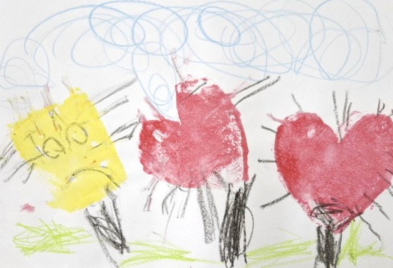 ผลงานพิมพ์ฟองน้ำแบบต่าง ๆ ด้วยสีน้ำวาดรูปต่อเติมตามความสนใจ ธีร์ : แม่มีพัดหลายอันเอามาพัดให้ธีร์เย็น ๆ
