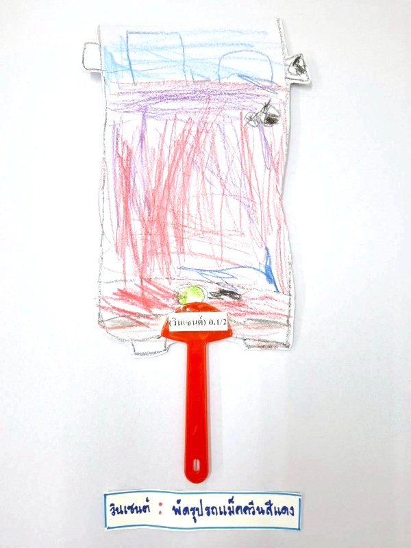 ผลงานติดรูปทรงแล้ววาดรูปต่อเติมเป็นพัดแบบต่าง ๆ ตามความสนใจ วิลเลี่ยม : พัดของวิลเลี่ยมรูปทรงวงกลมหน้าวิลเลี่ยมเอง แล้วก็มีรูทรงงหัวใจ เวลาเราเอามาพัด ก็จะมีลมเย็น ๆ