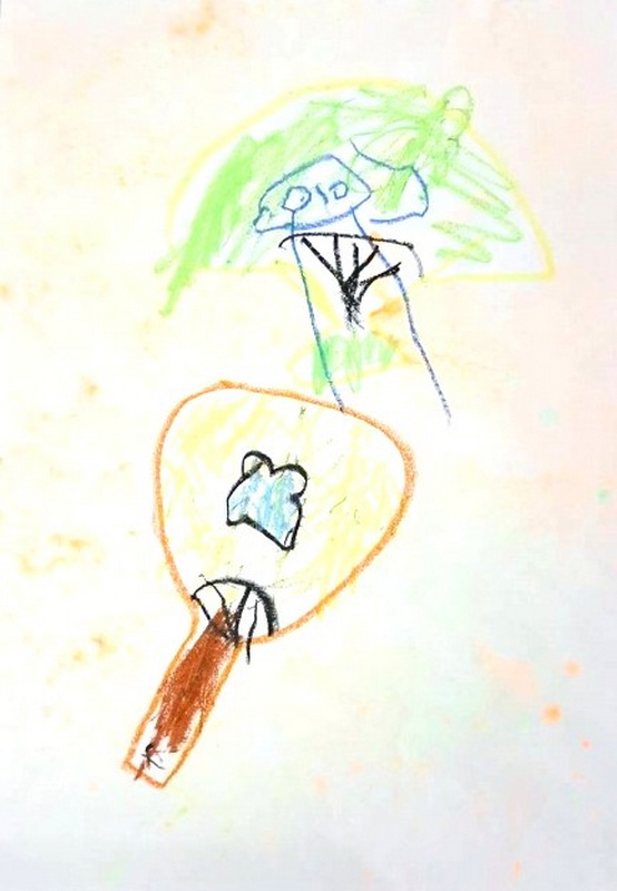 ผลงานพ่นสีน้ำและวาดภาพต่อเติมเป็นพัดแบบต่าง ๆ พราว : น้องพราวมีพัดอันใหญ่ น้องพราวจะเอาไปพัดให้หม่าม้าหายร้อน