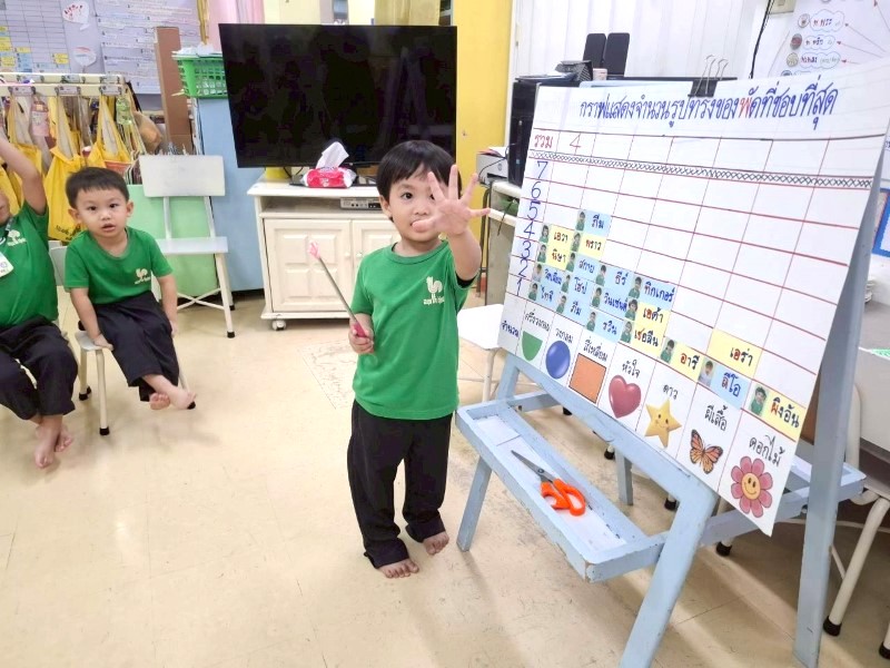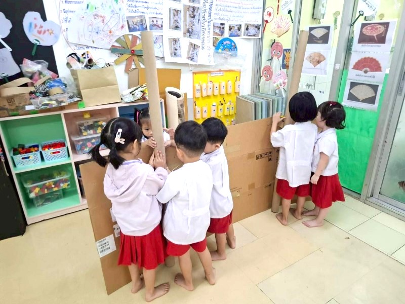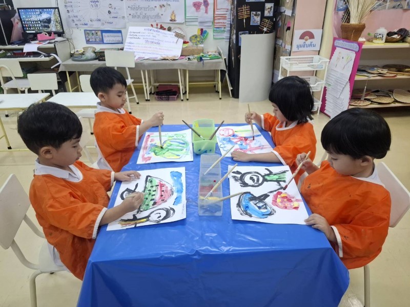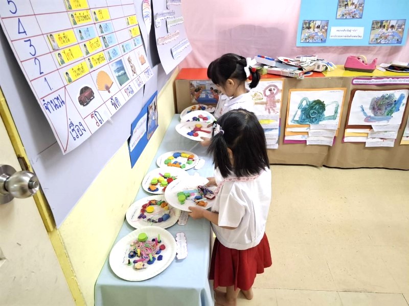 เด็ก ๆ ได้ช่วยกันนำศิลปะที่วาด ประดิษฐ์ มาจัดวางเตรียมให้ผู้ปกครองมาดู เด็ก ๆ ตั้งใจและช่วยเหลือกันดี
