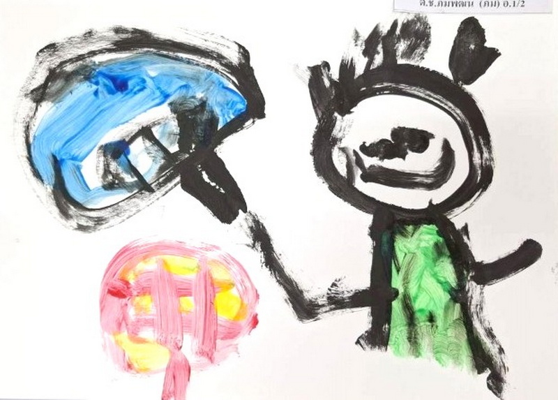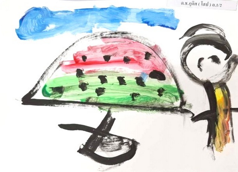 ผลงานวาดภาพสรุปการเรียนรู้เรื่อง “พัด” ด้วยสีน้ำ รวิน : รวินรู้เรื่องพัด พัดมีหลายรูปทรง รวินชอบพัดรูปสี่เหลี่ยมอันใหญ่ พัดแล้วจะมีลมออกทำให้เราเย็นสบายเลย