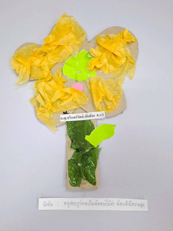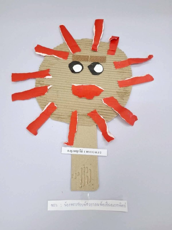 ผลงานปั้นสรุปการเรียนรู้เรื่อง “พัด” ด้วยดินน้ำมัน เอร่า : เอร่ามีพัด 2 อัน เป็นพัดพลาสติกรูปทรงวงกลมลายดอกไม้กับหน้ายิ้ม
