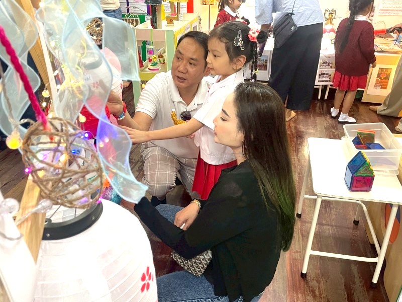 ดาต้าเล่าอธิบายเกี่วกับการประดิษฐ์โคมไฟ โดยมีหลอดไฟประดับเปิดได้จริง ให้คุณพ่อดู