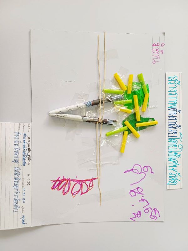 ผลงานการสร้างภาพต้นกล้วยโดยใช้เศษวัสดุ ยูนีค : หนูไปดูต้นกล้วย เห็นใบกล้วยมันเริ่มจะเหี่ยวแล้ว