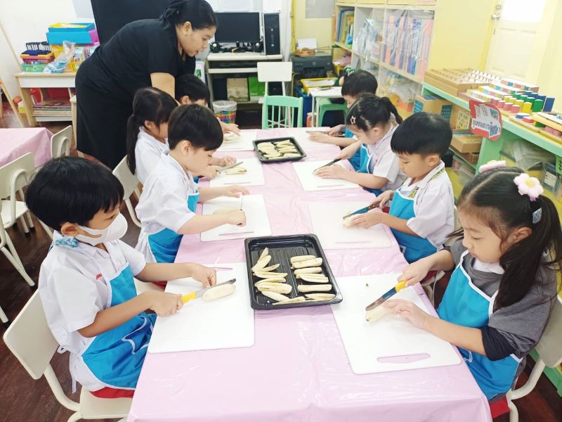 เด็ก ๆ หั่นกล้วยน้ำว้าตามแนวยาว นับจำนวนชิ้นที่หั่นได้และนำใส่ถาดเพื่อนำไปอบ