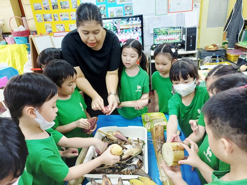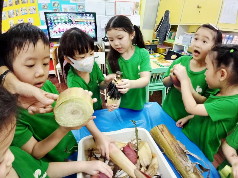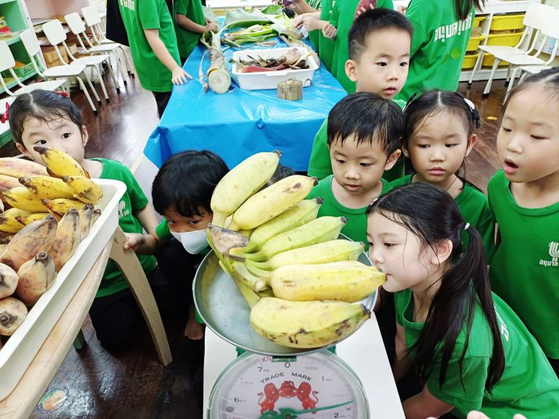 เด็ก ๆ ใช้ประสาทสัมผัสในการสำรวจส่วนประกอบของต้นกล้วยและบอกลักษณะ เช่น ผลกล้วย เมล็ดกล้วย